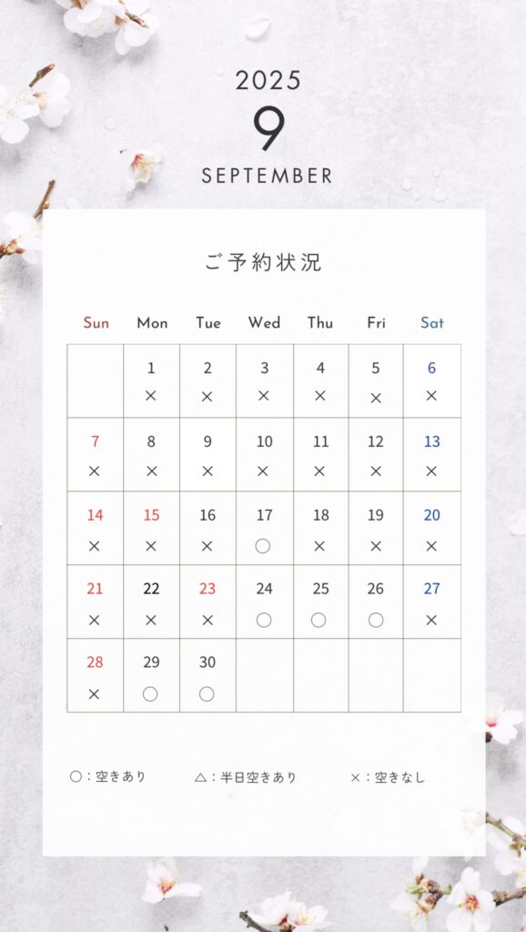 最短で2025年9月17日9時~、24日9時~、25日9時~ご予約可能です。