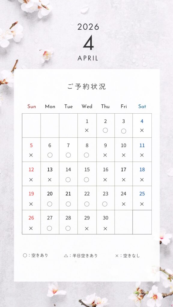 最短で2026年3月11日15時~、16日9時~、18日9時~ご予約可能です。